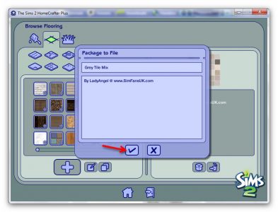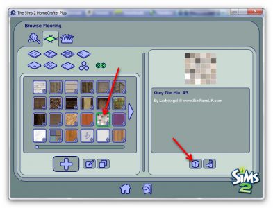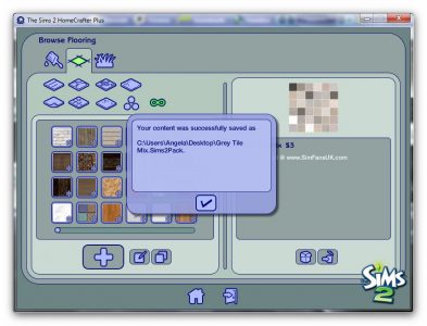 Before you close Homecrafter to try out your new floor in-game, I’ll show you how to save your custom content to share with others. In the browse flooring screen, select your new floor and click the ‘Package to File’ icon at the bottom of the right-hand screen: