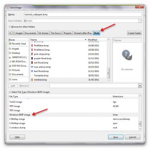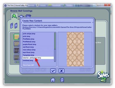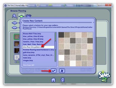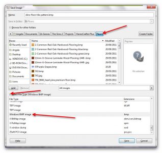 Browse to your Homecrafter folder in ‘Documents/EA Games/The Sims 2/Projects/HomeCrafter Plus/Floors’. Make sure you save it as a bmp file by clicking ‘Select File Type’ at the bottom, and selecting ‘Windows BMP Image’: