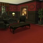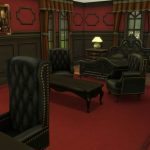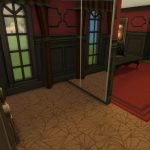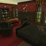 This is a very dark and masculine bedroom with a semi-private dressing area.
