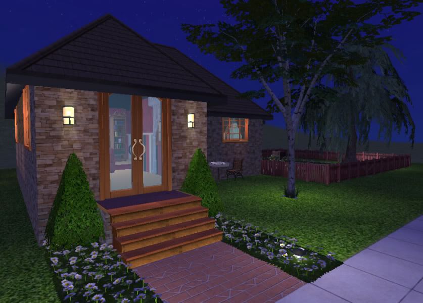 1 bedroom bungalow with large Garden. The custom content included are the wallpaper in the lounge and bedroom, the floors in the lounge and back entrance, and the exterior masonry wall covering, all by me. The wallpaper in the back entrance is by triciamanly. The bushes outside the exterior doors are Maxis, downloaded from TheSims2.com
