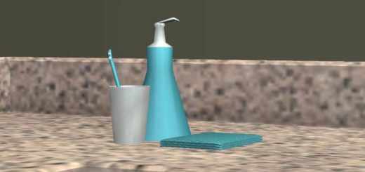 Here are a few bathroom accessories: A soap dispenser, cup with toothbrush and 3 facecloths