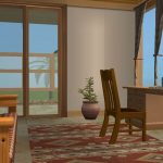Sim landscapers were given the task of designing the garden for this ultra tropical modern villa. They didn’t want palm trees all the same height so they dug ditches and planted some trees deep in the ground. Same thing for the midbiscus shrub and the birch tree. This way they could have lush landscaping without using any trimmable shrubs or waterable flowers.