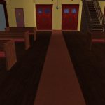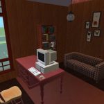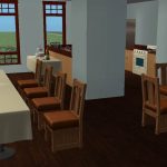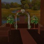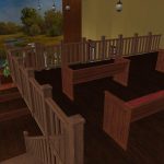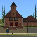 For some reason, none of the custom content in the neighborhood made it into the file. This church has a floor to ceiling mural which the members proudly show off as it was painted by Sister Nora Barnett, a professional artist. The church also includes little wooden pews with red padding and a podium for the minister to keep his notes on, although he has a habit of walking around on the stage so he can make eye contact with each person in his audience. The church is currently decorated for a wedding and the wedding table in the fellowship hall is all ready with a beautiful cake and sparkling cider. If you need a nice little church for Sim weddings, I hope you’ll consider the Piney View Church. Oh, and if you have any unfortunate deaths in your neighborhood, the church has a well kept graveyard right next door.