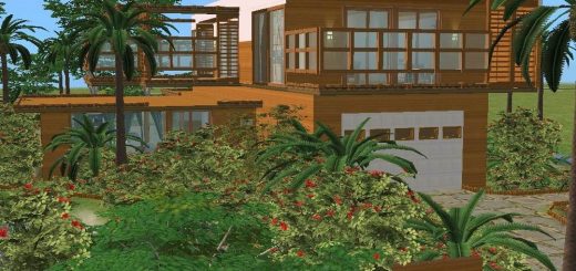 The house itself is all natural wood from the local rain forest, and natural stone tile made from local river stones. Other tropical features include a sort of “floating veranda” on the second floor and lots of floor to ceiling windows to let in the views and natural light. Base game garage is hopefully convertible to real.